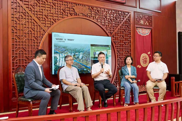在理论分享后,圆桌对谈从实践层面深化主题。上海奉贤发展(集团)有限公司党委书记、董事长朱文忠作为建设者代表,以“城市功能焕新、空间缝合、文脉延续”的具体举措,讲述老城复兴中“15分钟社区生活圈”的打造思路。“最美阅读空间”偒傣书房负责人张海涛则以方言文化推广为例,表达了公共文化阅读空间在城市更新中的责任与担当:“书房取名‘偒傣’,意为奉贤本地吴语‘这里’,我们通过方言读物、本土文献展陈,让市民在阅读中找回归属感。”