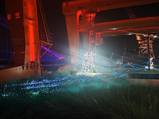 在复兴岛船台PARK,一场名为《百年光潮》的3D Mapping光影秀,让始建于1973年的120吨巨型塔吊“活”了起来。钢铁骨架在光影的雕琢下,化作讲述杨浦百年工业文明与数字未来对话的“活历史”。斑驳的锈迹与流动的光束交织,仿佛时光倒流,又似未来已来,震撼了每一位驻足的观众。这场秀不仅是技术的胜利,更是对城市记忆的深情致敬,让工业遗产在光影中重生,让城市文脉在创新中延续。