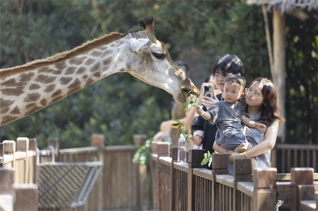 10月6日,小朋友在上海野生动物园与长颈鹿互动。 新华社 图