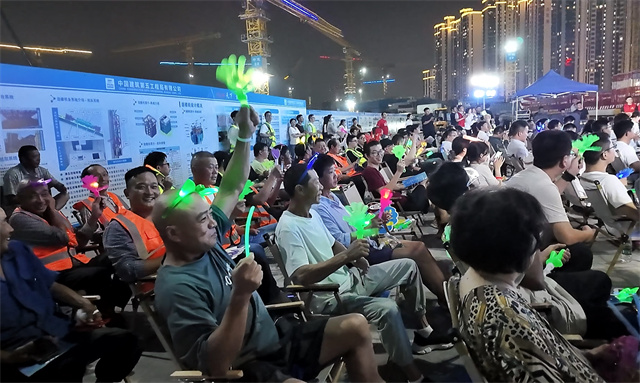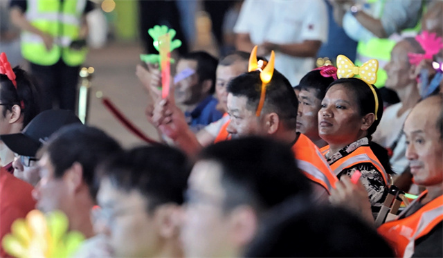 当晚,不少工友刚结束一天的工作,有的刚检查完设备,有的刚绑扎完钢筋,身上还带着些许疲惫感,但一听到音乐响起,大家纷纷聚拢过来。熟悉的旋律响起,点燃了他们内心带着钢筋水泥里的热忱和脚手架上的梦想,现场气氛逐渐热烈起来,掌声、欢呼声不断。