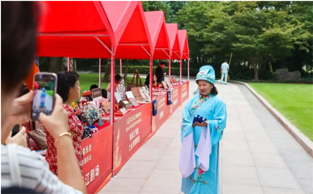活动现场,爱国主义教育市集吸引市民驻足。徐汇区内多家红色场馆与爱国主义教育基地齐聚一堂,通过互动体验、文创展示等方式,让市民“零距离”感受红色历史。