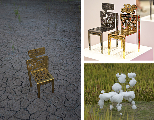 客厅里王帅的作品中,穿插着不同风格的艺术装置——几把小椅子的装置是李泉龙的“White Chair”系列。它提出的问题类似“认识你自己”的箴言,关乎一个人内心的价值取向。李泉龙坦言,为“White Chair”取名“安放我”费了不少心思。回顾该系列所有作品,他自问:创作这些椅子的动力是什么?“我希望每个个体都有时刻觉察、追问自我的意识。这不只关乎人生的自洽。我相信向内求索的力量。尽管每个人各不相同,都有独属于自己的特征,但所有人也有相同的部分,那些藏在我们身体里看不见摸不着、直抵本源的东西,终其一生我们都在向它靠近。”