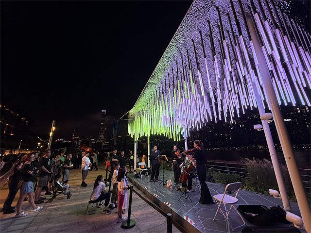 在这里,可以看到象征着董家渡3.3万白领职工的《能量守护林》,通过日光折射与夜间随环境呼吸的灯光,将都市节奏与自然节律相连,呈现个人微笑能量汇聚成都市绿色守护的理念。可以在《光愈林》下欣赏各项特色表演,与同济大学合作的这座灯光装置俨然成为了活动滨江区域的夜景视觉焦点,通过光色与音律对应五脏五态,融合现代照明技术与中国传统哲学及养生理念,打造出一个沉浸式的光音疗愈空间。