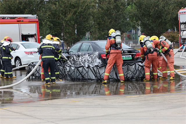 当驻守在P7停车场的消防人员正在利用随车装备快速开展救援时,新能源电车由于电池热失控,火势越来越猛烈。为防止电池着火后的连锁反应,消防员使用电动移车器转移事故车辆旁边的无驾驶员车辆,并打开救援空间,消防人员在现场组装建立阻燃冷却围堰,对底盘电池注水冷却。