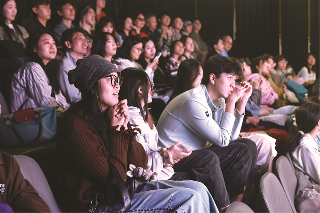 在小剧场里聚精会神看剧的年轻人。