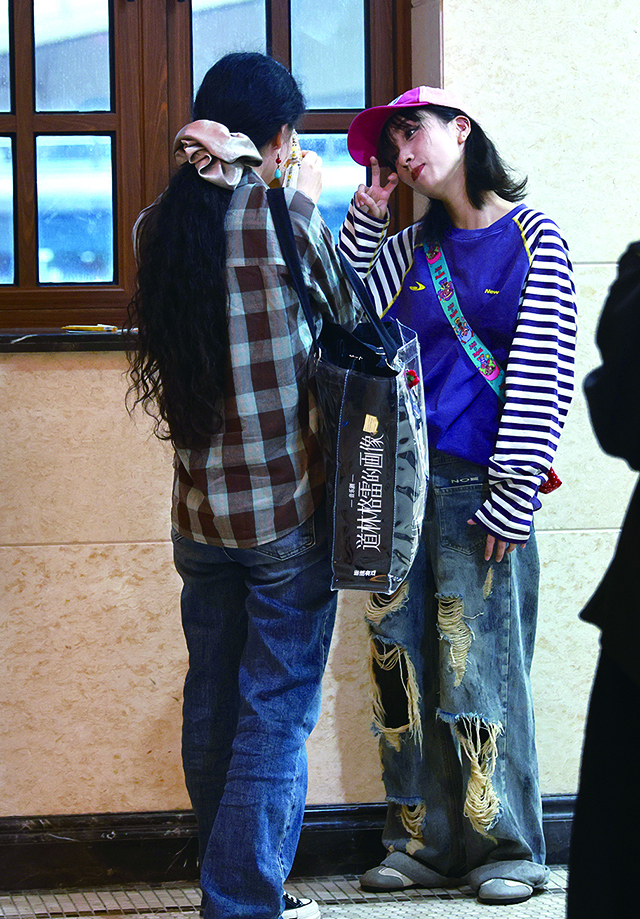 粉丝(左)在演出结束后和演员近距离交流。
