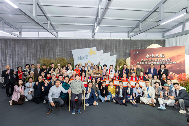 当天,作为上影集团纪念中国电影120周年系列活动的重要组成部分,“永恒光影”上影演员剧团2025重阳敬老活动在上影演员剧团举行,吕其明、于本正、牛犇、向梅、达式常、梁波罗、乔榛等60余位上影集团的老中青艺术家和参加活动的领导与嘉宾齐聚一堂——外墙上,老一代艺术家们扮演的经典角色形象,向来往行人传递着“光影之美”与“上影记忆”;院墙内,电影艺术的后来者们则用自己的行动,续写着上海电影不凡的历程。