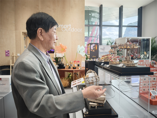 随后,百名老人奔赴游园之旅。在模速空间“晞颐AI体验馆”里,老人们玩转各种“AI+养老”黑科技赋能居家养老的新产品。已经年过七十的章爷爷兴致十足地和萝卜下棋机器人PK了几局,当看到机器人连下两子后,立即叫了起来,“侬不好耍赖的!”现场,他还看中了一款能自动旋转的精美的拼图游戏,表示想要买成品。“我就买自己拼不好,这个看着很精致。价格也不贵的。”工作人员耐心接待了这位充满童趣的“老顽童”,“爷爷,你要买回去自己拼的,这样才有乐趣。”