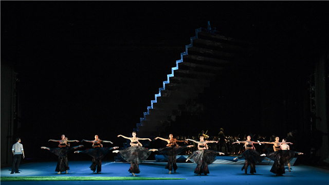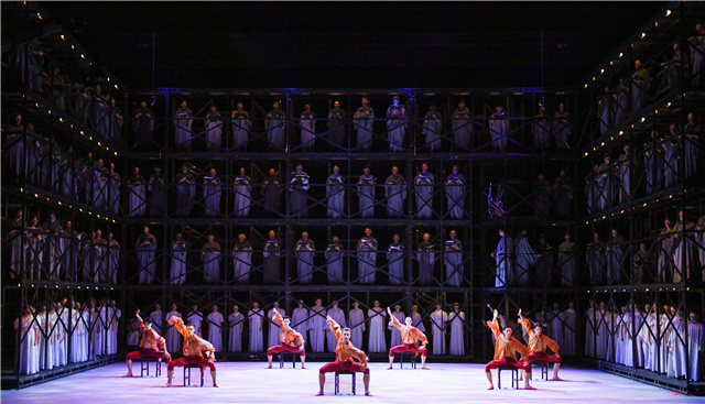 两部作品演出时,过百位歌唱家登上环绕舞台的八米高台现场演唱,加上唯美的舞蹈,效果极为震撼。