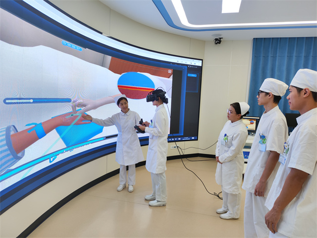 “以前同学互扎,或者拿自己练手,怕疼更怕扎错。现在有虚拟仿真基地,问题迎刃而解。在虚拟仿真实训室,机器手臂的触感、血管走向与真人几乎一致,进针瞬间电脑同步监测,角度稍有偏差立刻语音提示,真实度高达95%。”日前,潘美娟带领记者走进济光虚拟仿真实训中心。早在2021年,这里就获批“上海市高等职业院校示范性虚拟仿真实训基地”。