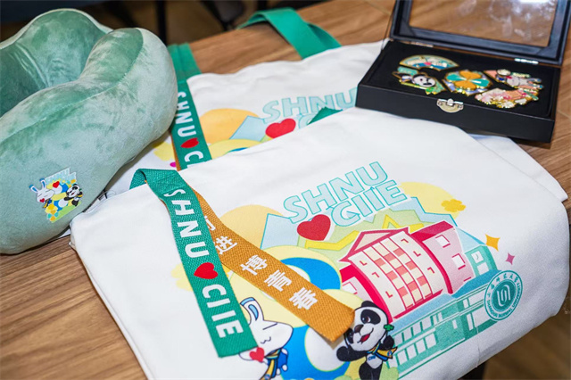 纪念徽章以师大四季为主题,寓意着上海师范大学走过的71个春华秋实,配套帆布袋、行李牌及颈枕,蕴含着学校对志愿者的祝福,为进博会增添了独特的文化色彩。