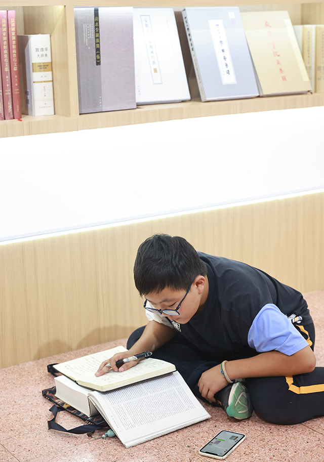 今年上海书展期间,热爱敦煌文化的小读者汪宏嘉席地而坐摘抄《敦煌学大辞典》。