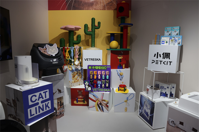 “宠物经济”区域,现场巨幅的猫咪海报和仙人掌造型的猫爬架来自宠物生活方式品牌——未卡(VETRESKA)。小佩(PETKIT)围绕智能饮水机、自动喂食器及全自动猫厕所三大核心,构建覆盖宠物全场景的智能健康生态,产品远销全球180多个国家和地区。