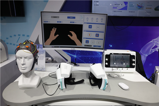 脑机接口展台前,上海术理智能科技有限公司工作人员正介绍一套用于中风、偏瘫等神经受损患者的康复设备。患者佩戴一顶拥有16个接触点的“脑电帽”,系统通过箭头与声音引导其进行运动想象。“当患者想象左手握拳时,脑电信号被捕捉、解码,进而驱动外骨骼带动手部运动,通过反复刺激重建神经通路,”工作人员解释道,“该技术已是成熟临床方案,在长海医院等机构已有上千例应用。”