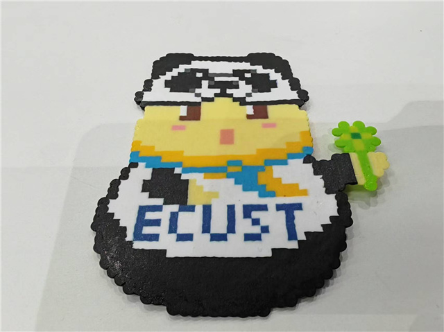 “大约在休息时间花了两小时,使用了十余种颜色的豆子,按照预先设计的草图将一粒粒豆子在格板上有序排列,再经过高温熨烫使豆粒融为一体。”吴靓介绍,作品主体是华理吉祥物“小花梨”,身着进宝熊猫服饰,手持四叶草。在她看来,这一颗颗豆子就像每一名“小叶子”,通过点滴努力和志愿奉献,汇聚成服务进博的全景画卷。