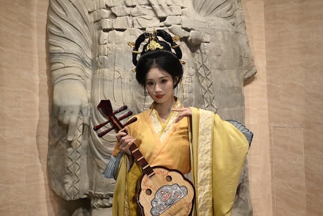 11月8日下午,多位汉服爱好者亮相云冈石窟艺术特展国风音乐季活动现场,在“第12窟”内进行流动巡演。当衣袂飘飘的身影穿梭于千年石窟的复刻空间,与壁上的“天宫乐伎”浮雕相映成趣,营造出“仙人如画,步入石窟”的梦幻场景。