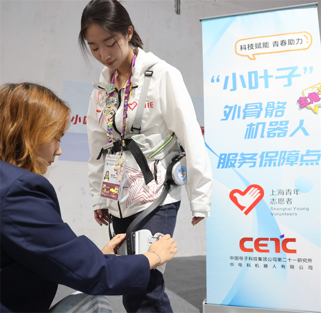 这款轻量化外骨骼机器人是由中国电子科技集团公司第二十一研究所青年工程师团队专为进博会迭代而成。团队在跟随团市委调研时发现,行走体力消耗大是志愿者“小叶子”们的痛点之一,而他们一直认为实验室技术的终极目标是落地服务大众,便主动提出要把机器人带到进博会,为“小叶子”减负。