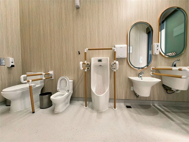 “以前轮椅推不进来,现在这坡道走得稳,扶手也结实。”在茶陵绿地公厕,年过七旬的张大爷沿着无障碍坡道缓缓走入,门口拓宽的通道、墙面加装的木纹防滑扶手,让他的如厕之路少了阻碍。改造后的公厕,室内地坪高度降低,圆角防撞设计搭配墙面防撞条,有效避免磕碰风险;厕位旁的紧急呼叫按钮格外醒目,“按下就能联动管理室,万一有事能及时响应,心里踏实多了。”公厕管理员介绍道。