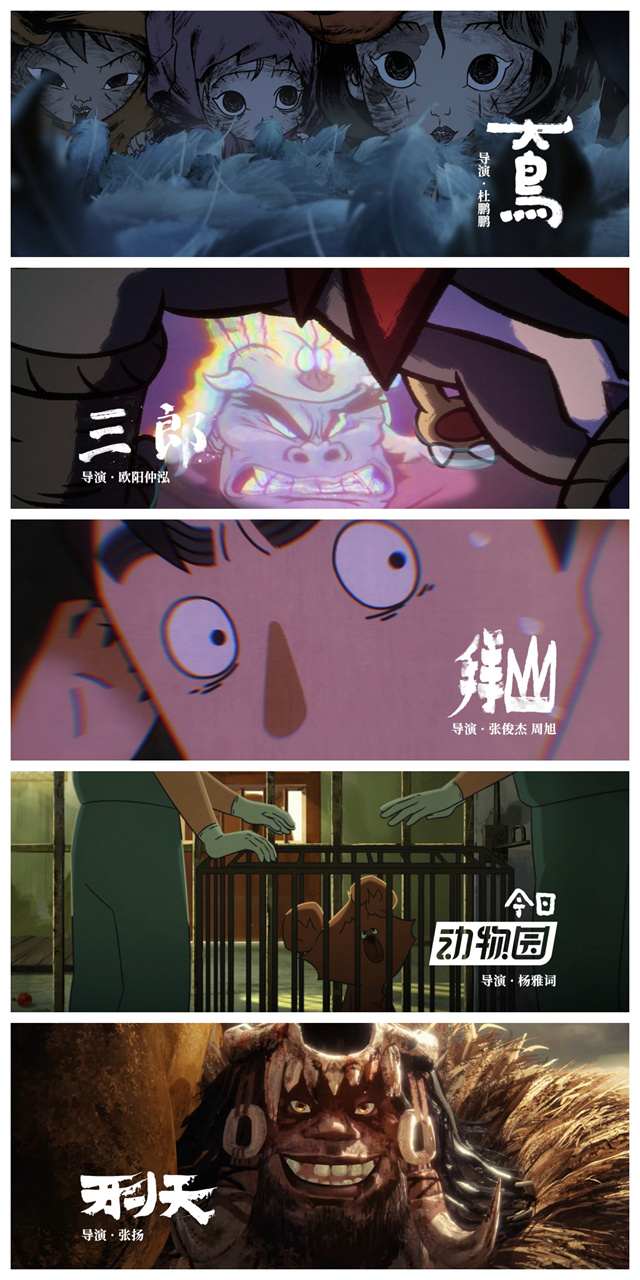 5组新加入的导演,用5部作品为该系列注入了更多元的艺术表达:杜鹏鹏执导的《大鸟》以暗黑童话风格,讲述了一个关于救赎与守护的故事;欧阳仲泓执导的《三郎》结合大漠武侠与科幻元素,展现自我执念中的江湖困境;张俊杰与周旭合作的《拜山》穿梭于奇幻写实的客家文化与现代都市之间,探讨人与故乡的牵绊;杨雅词在《今日动物园》中以复古画质和伪纪录片风格,幽默而犀利地呈现“打工动物”的世界;张扬执导的《刑天》则融合三维技术与手绘质感,以粗粝写实的风格重新演绎上古神话的史诗美学。