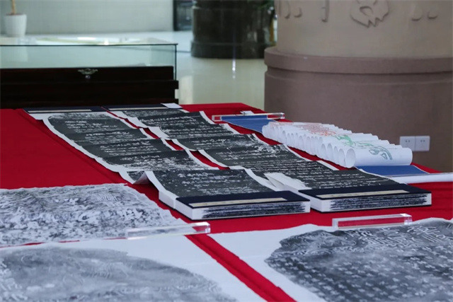 现场还展出多位藏书家的宋、明、清拓本,复旦大学档案馆的“护国寺感通塔碑”全形拓片,还有上海市殷商甲骨文研究院慷慨赠予的甲骨文等书法龙鳞装书卷等,古老的文字与装帧技艺在此焕发新生。