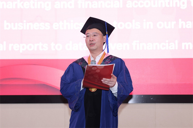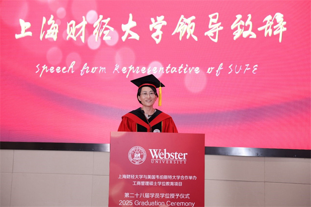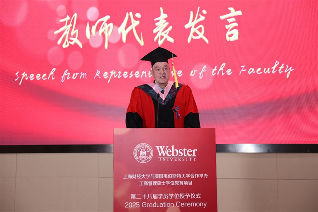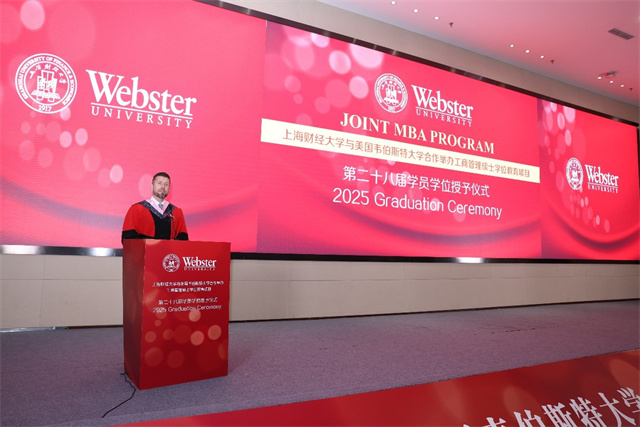 特别地,美国韦伯斯特大学全球校区副校长Ryan Guffey不远万里亲临现场,向毕业生们送上美好祝福。他非常赞赏并重视两校之间跨越近三十年的长久友谊和合作,自1996年携手启程,两校的伙伴关系不仅经受住了时间的考验,更在岁月的沉淀中愈发坚韧、生机盎然。iMBA项目持续输出兼具上财理论深度与韦伯斯特实践广度的跨文化领导者。面向绿色经济、数字货币与AI重塑商业的未来,两校将共同承诺,坚守创新,深化合作,助力每一位个体在不断变化的世界中茁壮成长。