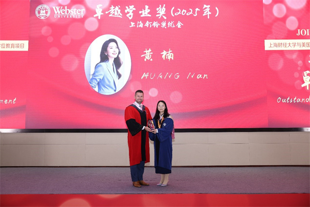 美国韦伯斯特大学全球校区副校长Ryan Guffey为黄楠同学颁发上海钉铃奖优金“卓越学业奖”奖杯。