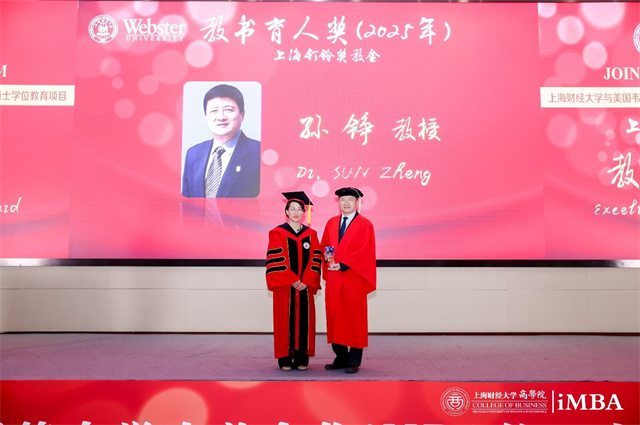 本次获得上海钉铃奖教金“教书育人奖”的是孙铮教授和杨楠教授。现场由上海财经大学党委常委、副校长靳玉英为孙铮教授颁发奖杯。