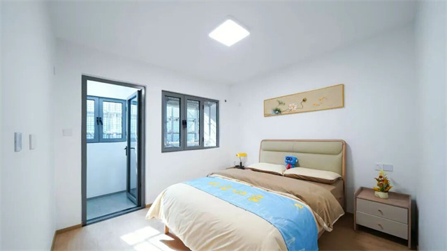 “我们在设计时充分兼顾居民的实际使用需求,借鉴商品房项目的成熟经验,为每户配置了包含洗手盆、马桶和淋浴区域的卫生间三件套。”上海天华建筑设计有限公司副所长刘小娣介绍说,设计团队严格把控各区域尺寸,在面宽允许范围内最大化拓展使用空间;同时通过走廊实现厨房和卫生间的间接通风采光,既节省了交通空间,又能满足基本使用功能。考虑到用地和层数的限制,无法让所有朝北住户都调整为朝南,设计团队便采取“一户一方案”的定制化思路,将部分住户调整至东西向,让他们能享受到早晚的自然采光,相比原先朝北的居住条件有了明显改善。
