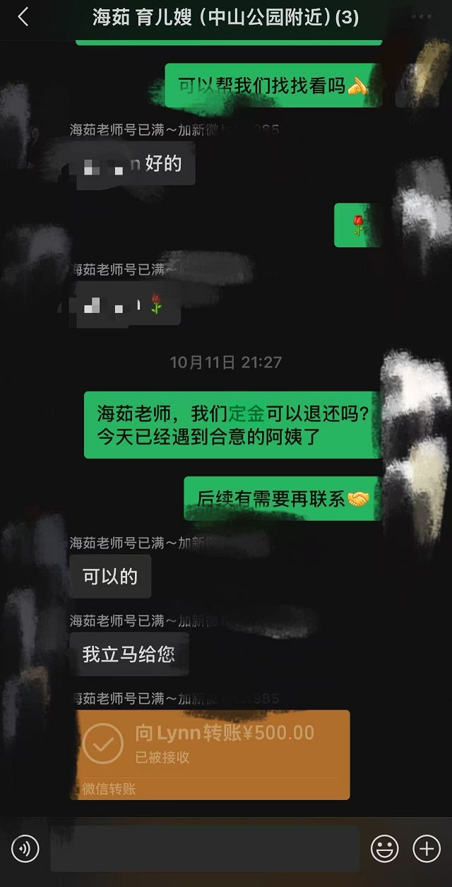 上海市民孙女士同样是一名新手宝妈,她向记者反映,去年年底怀孕期间在58到家找钟点工阿姨帮忙做家务,签订半年合同支付服务费2700元,服务3个月后因分娩在即主动要求中止服务,中介称剩余650元服务费可返还。但她今年11月再次尝试联系中介时,这名中介已辞职,并将其交接给另外一名中介。后者表示服务期已到无法退费。如今分娩完后,她又陷入了找育儿嫂的难题。