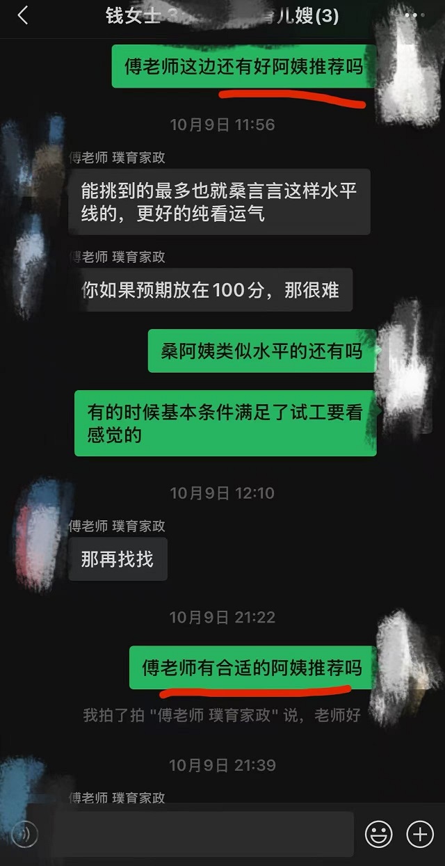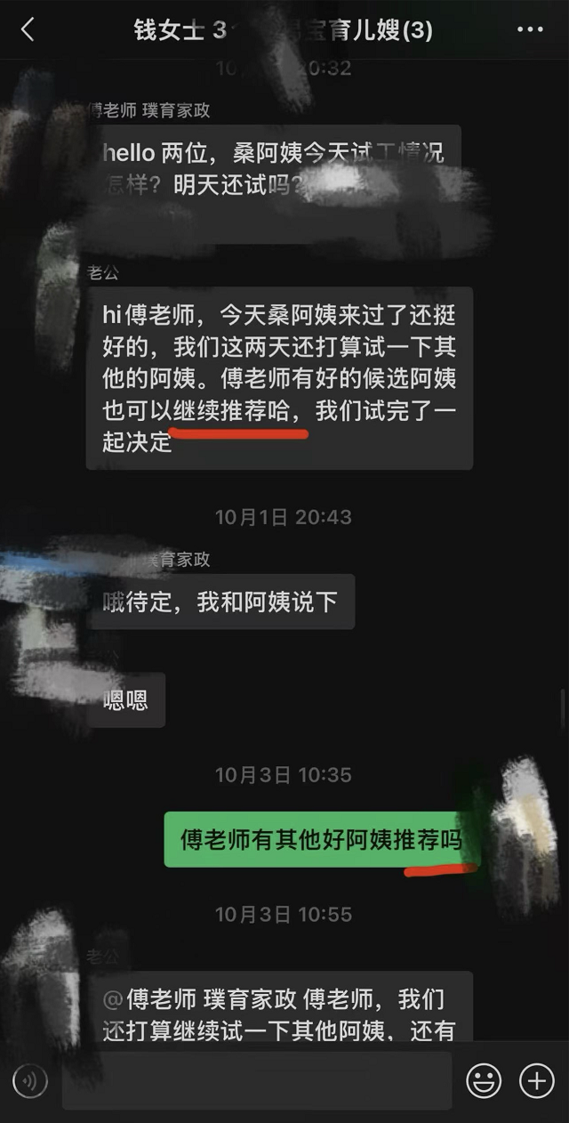 这一点在钱女士提供给记者的聊天记录中得到印证。聊天记录中,钱女士一家对第二位育儿嫂的评价是“还挺好的”。接受采访时她进一步表示,推荐的育儿嫂经验不错,但有些许缺陷,试工结束后向中介表达较为委婉,让机构继续推荐其他育儿嫂是希望能找到更好的人选。
