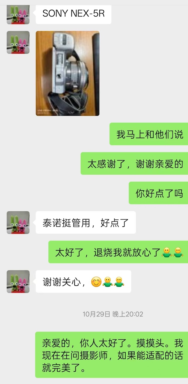 11月19日,居建琴、刘峰上门“验机”。杨飞从防潮箱里取出相机的那一刻,两人激动不已。机器看上去像新机一样,保养得当,电池仓完好,连原装电池、肩带等也一应俱全。居建琴现场对着杨飞连拍数张照,放大到200%无坏点,又测了闪光同步、HDR连拍,“它的对焦声音,比我原来那台旧的要清脆得多,太完美了。”