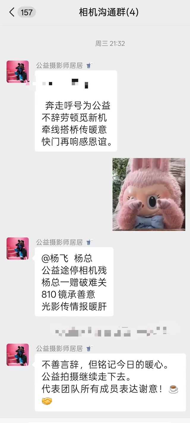 11月20日晚上,居建琴在“相机捐赠群”里发出两首打油诗,其中一首给杨飞的写道,“公益途停相机残,杨总一赠破难关,810镜承善意,光影传情报暖肝”。