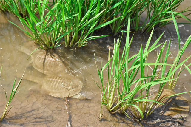 与常规高密度养殖每亩投放千余只甲鱼幼苗不同,这里每亩仅投放40~50只。甲鱼以稻田中的昆虫、小鱼小虾为食,无需额外投饵。它们的活动能搅动水体、促进水稻根系活力,其粪便则成为天然的有机肥。近年来的数据监测显示,该模式比单一种植水稻增产约15%,同时实现化肥农药减量、土壤肥力提升和生态循环。