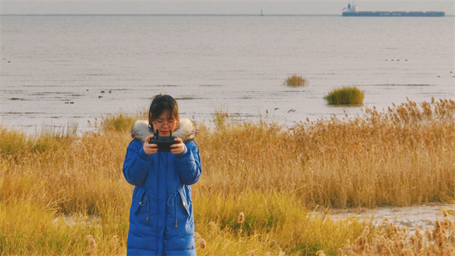 陈先意在滩涂上放飞无人机。