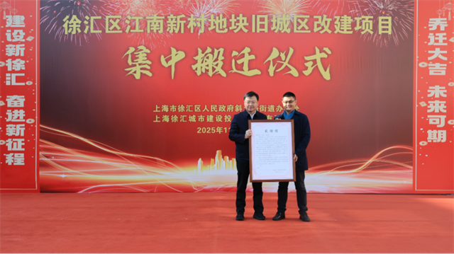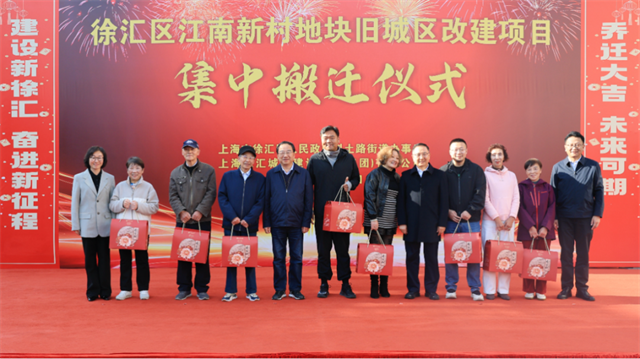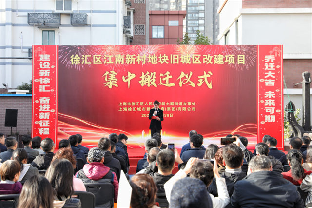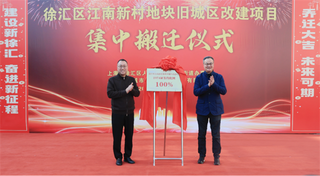在集中搬迁仪式上,上海市城乡建设和交通工作党委副书记、上海市住房和城乡建设管理委员会主任王桢,与徐汇区委书记曹立强共同揭牌公布徐汇区江南新村地块旧城区改建项目签约比例。红色幕布落下的瞬间,现场掌声雷动,许多居民举起手机记录下这一刻。