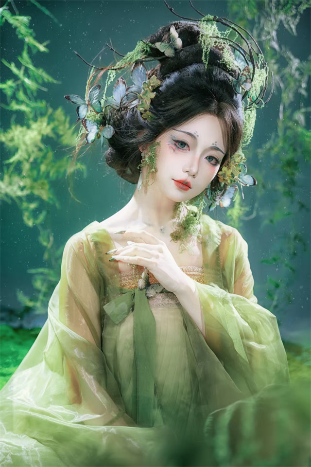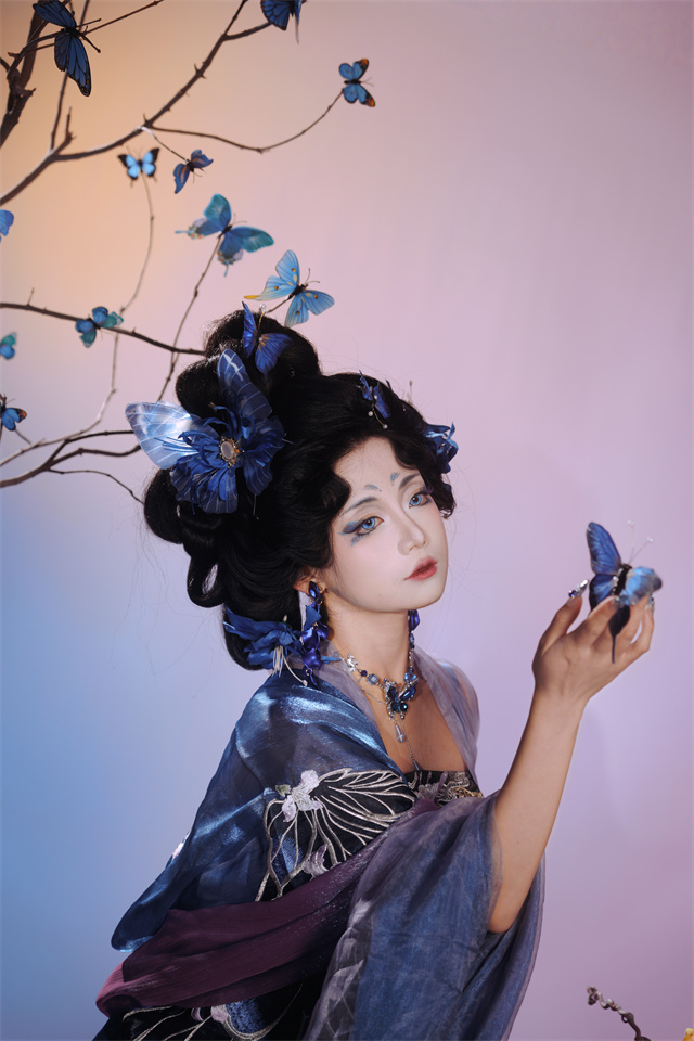 于美琦:给大家分享两个国风创意造型吧。一件是以春日万物萌发为灵感的妆造,在发型中融入了树木枝条和苔藓,体现自然的生命力。另一件是以蓝闪蝶为灵感的妆造,将美瞳、卷发等现代技法融入国风妆造中,打造了一种中式奇幻的风格。