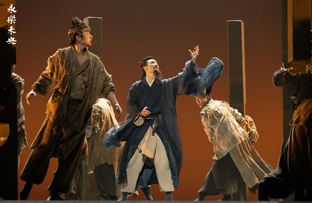 《永乐未央》讲述的正是这一伟大的工程。在舞剧中人们可以看到当代建筑师与古代督建者“心神”交汇,见证“立观度人,时不可失”的建宫宏愿;元代女画工与当代美术师夙愿共鸣,将生命祈愿融入《朝元图》;琉璃匠师与七百余岁老角神携手,复原失传的孔雀蓝釉琉璃制法;平均年龄不到30岁的迁建者“和三门峡争先,和黄河水赛跑”,终让永乐宫重获新生。