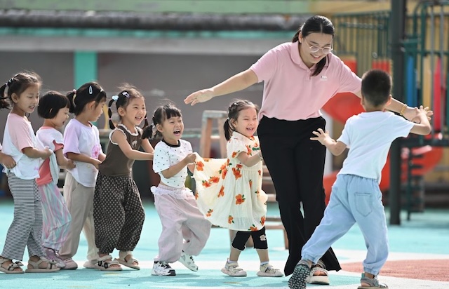 2025年9月10日,在山东省滕州市西岗镇中心幼儿园(柴里)分园,老师和小朋友一起玩“老鹰捉小鸡”趣味游戏。新华社发(李志军 摄)