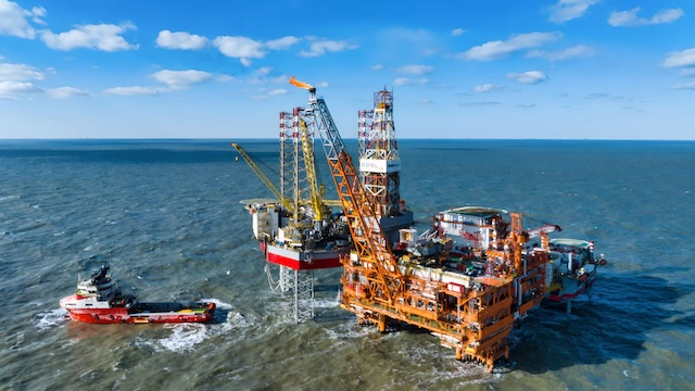 这是2025年2月8日拍摄的渤中26-6油田一期开发项目海上作业平台(无人机照片)。新华社发(杜鹏辉 摄)