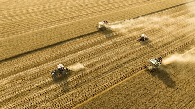 2025年6月4日,在河南省商丘市梁园区李庄镇潘堂村志诚种植农民专业合作社,农机手操作机械在农田作业(无人机照片)。新华社发(李恒 摄)