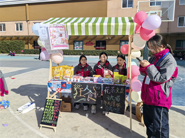 “我们的店铺主打两大类目:颜值与质感兼具的个性饰品和健康无负担的特色食品,承包大家的快乐体验。”店铺营销环节,形象设计专业的高娜娜作为“燃烧的六姐”店铺的店长与搭档王欣璐在主席台上推荐着店铺的“爆款”商品,并向同学们介绍重磅福利:消费满50元,直接赠送一次拍立得拍照服务。