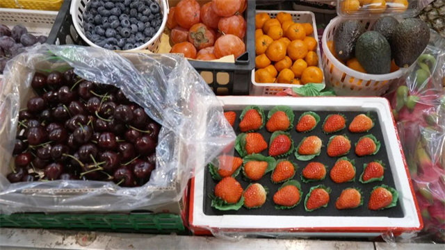 与此同时,车厘子也迎来了销售旺季。目前市集上在售的车厘子均产自智利,其中空运车厘子因运输时间短,新鲜度高、口感脆爽,售价约为58元/斤。据摊主透露,近期海运车厘子也将陆续到货,价格预计将回落至30—40元/斤。不过,由于海运周期较长,其新鲜度与脆感会略逊于空运产品,市民可按需选择。