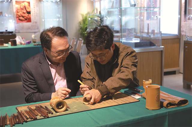 侯旭辉自知短板,近来一有空就埋头练习古朴的中山篆。对他而言,做竹刻是一体两面:“一头是为了谋生,一头是为了不断学习。”他知道,当代年轻人肯定不缺学习技术的路径和方法,缺的是古人那种文化修养和全面沉浸其中的心境。