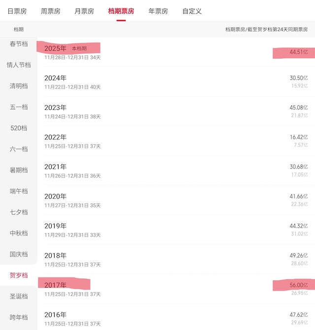 这个周末,随着《阿凡达3》的上映,中国电影近年来原本不算热门的贺岁档继续强势“冲冲冲”,截至12月21日中午13点13分已突破44亿,超过了2019年的44.32亿,暂列中国影史该档期票房第六。但在今年还有10天的背景下,仍在猛涨的2025年贺岁档票房,跻身三甲毫无悬念,甚至有望向2017年的冠军纪录发起冲击(56亿票房)。