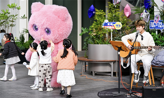 店庆日当天,商场的各种生日和礼遇纷至沓来。商场入口处的巨型生日装置吸引了大量消费者拍照留念,“生日快乐”的背景音乐在中庭和大弯壁广场上回荡,FUFUSOUL人偶与机器狗组成的巡游队伍不时引发围观,孩子们追着人偶奔跑,现场洋溢着节日般的热闹氛围。