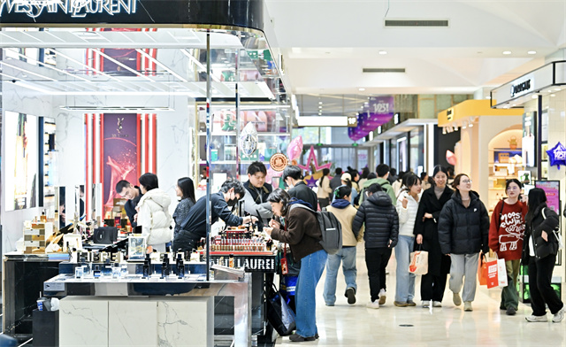在化妆品区域,雅诗兰黛柜台教练赵静告诉记者,今年的优惠力度堪称“五折左右”,例如“480元送七件套”“3980元送10件套旅行装”,且全场任意购买均可参与。许多顾客提前规划,设计备货用券攻略,等到跨年当天集中使用赠券,届时柜台也将从早到晚全员上岗。赵静还提到,由于日上免税店近期关闭,不少原本习惯在免税渠道购买的消费者也回流到专柜,使化妆品区域人气更旺。