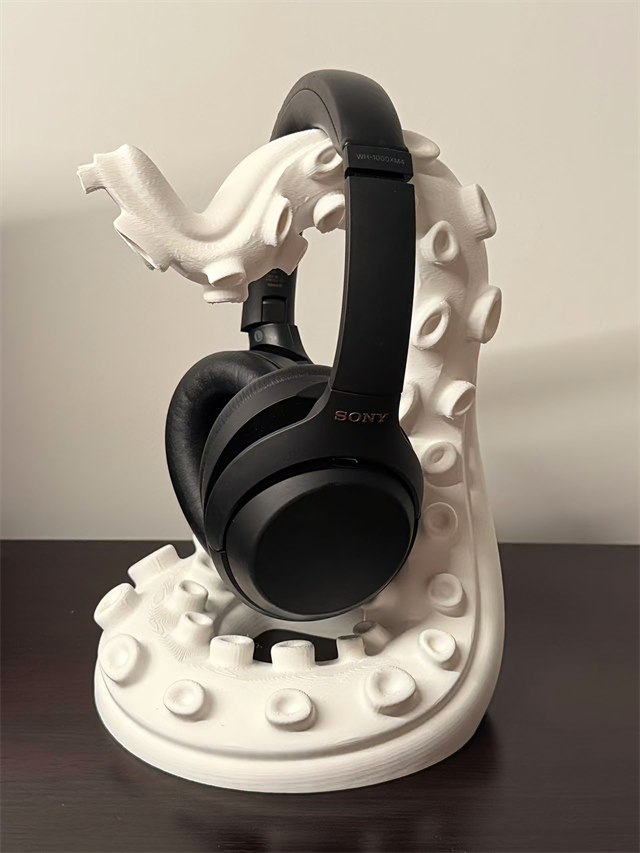 由于耳机支架存在弧度,为防止打印过程中因重心变化而造成坍塌,她特意设计了几个支架,保证打印中的稳定性。尽管如此,那天的陶桃显得有些心不在焉。无论在哪,她总是抱起手机,时不时地看看监控。“因为摄像头在打印机上面,透过它看章鱼触手还是有点吓人的。”幸运的是,她担心的事情都没有发生,制作很顺利。
