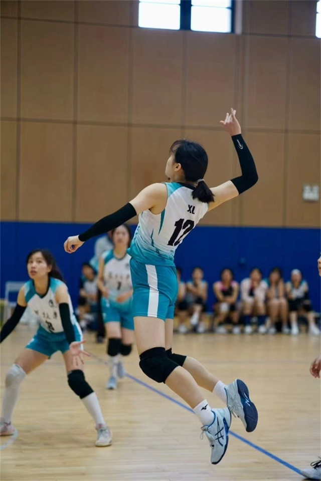 自高中开始接触排球的魏麒,2021年加入复旦大学阳光女排后,便再也没有停下奔跑的脚步。这支由普通文化生组成的队伍,没有专业运动员的底子,却靠着日复一日的磨合与坚守,在赛场上闯出了一片天。“排球是六个人的运动,任何一个人的短板,都可能成为对方进攻的突破口。”魏麒说,为了培养团队默契,球队每周六下午都会组织全队合练,医学院校区的队员们还会在每周二自发加练;即便没有合练的日子,大家也会各自坚持健身,保持良好的竞技状态。