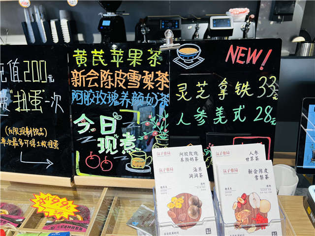 记者获悉,试营业以来,“氛子药局”已吸引了大量年轻人前来打卡。山楂棒棒糖、陈皮雪梨茶、灵芝拿铁等成为爆款单品,而外摆座位区更是成为文化广场周边难得的休憩空间。许多年轻人表示,在这里既能买到专业药品,也能喝到健康茶饮、体验轻松社交,是一种全新的“养生潮流”。