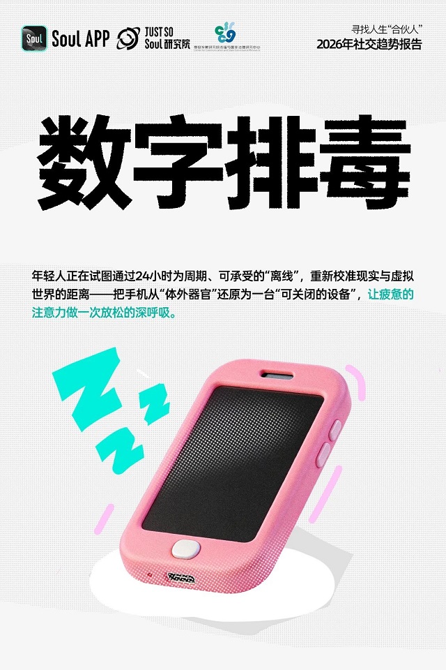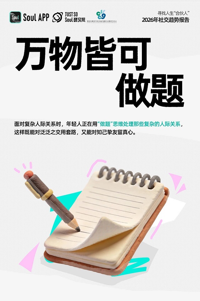 岁末年初之际,复旦大学传播与国家治理研究中心、复旦大学价值认知传播与人智协同治理交叉创新团队联合社交平台Soul App旗下的Just So Soul研究院最新发布《2026年社交趋势报告》。《报告》以“寻找人生‘合伙人’”为主题,将这一代年轻人的社交态度与实践总结为十大关键词:#Soulmanyships、#万物皆可做题、#重新养育父母、#AI精神股东、#像爱朋友一样爱自己、#通勤式疗愈、#数字排毒、#有效努力、#做个活人、#普通人的英雄主义。这些关键词共同描绘出年轻一代追求自由、真诚、有趣的普通人生活的生动图景。